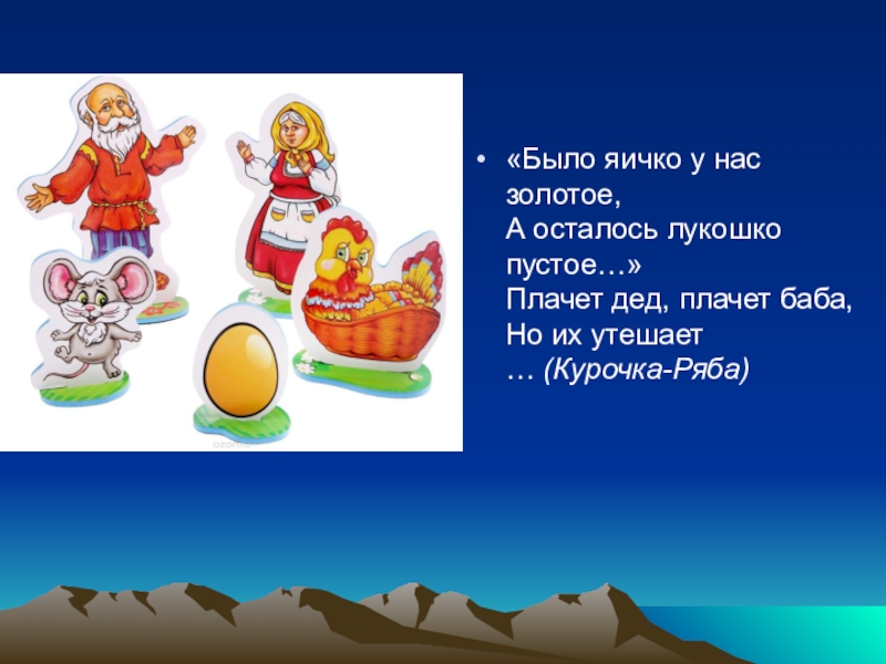 «Было яичко у нас золотое, А осталось лукошко пустое…» Плачет дед, плачет баба, Но их утешает … (Курочка-Ряба)