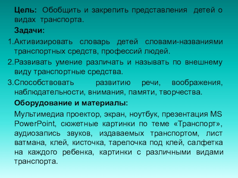 Цель:  Обобщить и закрепить представления детей о видах  транспорта. Задачи:Активизировать словарь детей словами-названиями транспортных средств, профессий людей.Развивать умение различать и называть по внешнему виду транспортные средства. Способствовать развитию речи, воображения, наблюдательности, внимания, памяти, творчества.Оборудование и материалы:Мультимедиа