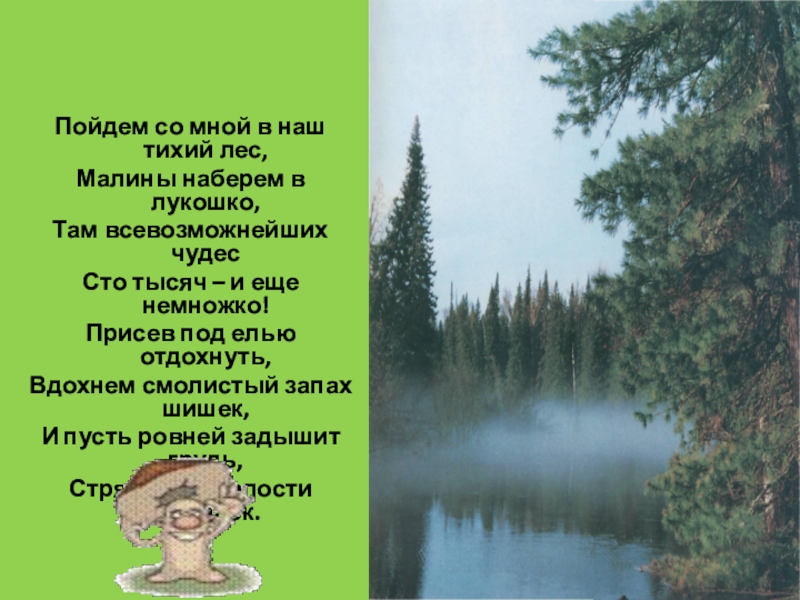 Пойдем со мной в наш тихий лес,Малины наберем в лукошко,Там всевозможнейших чудесСто тысяч – и еще немножко!Присев