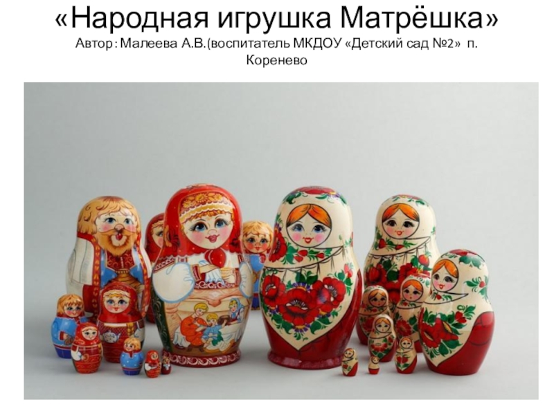 Слайд 1«Народная игрушка Матрёшка» Автор: Малеева А.В.(воспитатель МКДОУ «Детский сад №2» п.Коренево