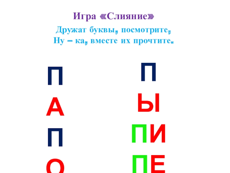 Игра «Слияние»Дружат буквы, посмотрите,Ну – ка, вместе их прочтите.ПАПОПУПЫПИПЕ