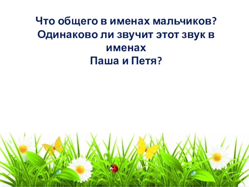 ПашаПетяЧто общего в именах мальчиков?Одинаково ли звучит этот звук в именахПаша и Петя?