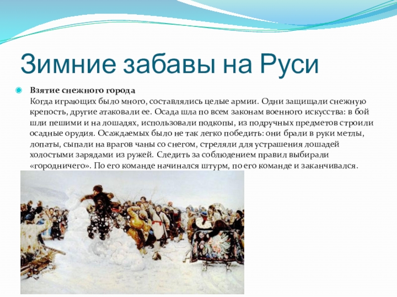 Зимние забавы на РусиВзятие снежного города Когда играющих было много, составлялись целые армии. Одни защищали снежную крепость,
