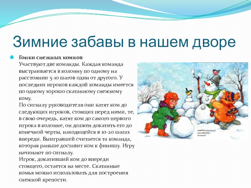 Зимние забавы в нашем двореГонки снежных комков Участвуют две команды. Каждая команда выстраивается в колонну по одному