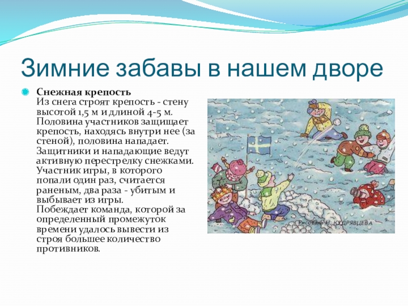 высотой 1,5 м и длиной 4-5 м. Половина участников защищает крепость, находясь внутри нее (за стеной), половина нападает. Защитники и нападающие ведут активную перестрелку снежками. Участник игры, в которого попали один раз, считается раненым, два раза - убитым и выбывает из игры. Побеждает команда, которой за определенный промежуток времени удалось вывести из строя большее количество противников.