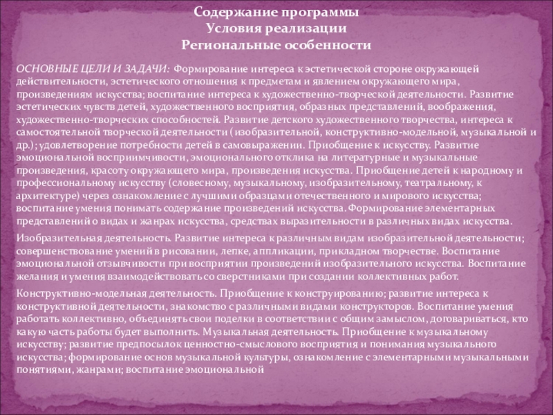 Цели реализации Программы: развитие личности детей дошкольного возраста в различных видах общения и деятельности с учетом их возрастных, индивидуальных психологических и физиологических особенностей, проектирование социальных ситуаций развития ребенка и развивающей предметно-пространственной среды, обеспечивающих позитивную социализацию, мотивацию и поддержку индивидуальности детей через общение, игру, познавательно-исследовательскую деятельность и другие формы активности.