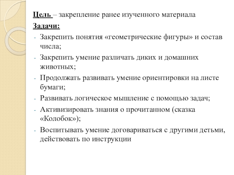 Цель – закрепление ранее изученного материалаЗадачи:Закрепить понятия «геометрические фигуры» и состав числа;Закрепить умение различать диких и домашних животных;Продолжать развивать умение ориентировки на листе бумаги;Развивать логическое мышление с помощью задач;Активизировать знания о прочитанном (сказка «Колобок»);Воспитывать умение договариваться