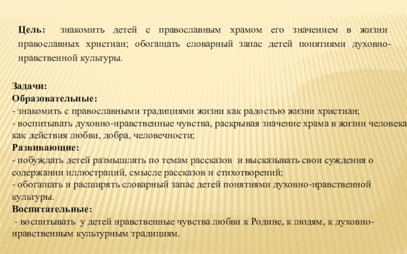 - воспитывать духовно-нравственные чувства, раскрывая значение храма в жизни человека, как действия любви, добра, человечности;