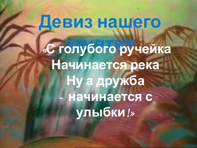 Девиз нашего занятия «С голубого ручейкаНачинается рекаНу а дружба -  начинается с улыбки!»