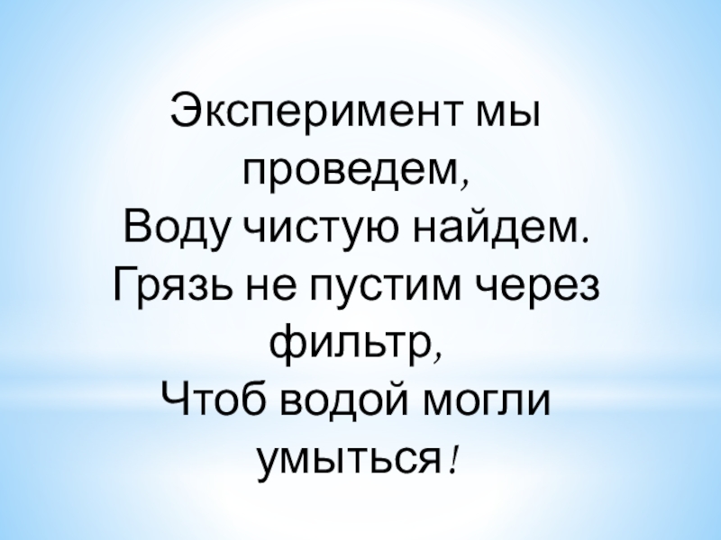 Эксперимент мы проведем,Воду чистую найдем.Грязь не пустим через фильтр,Чтоб водой могли умыться!