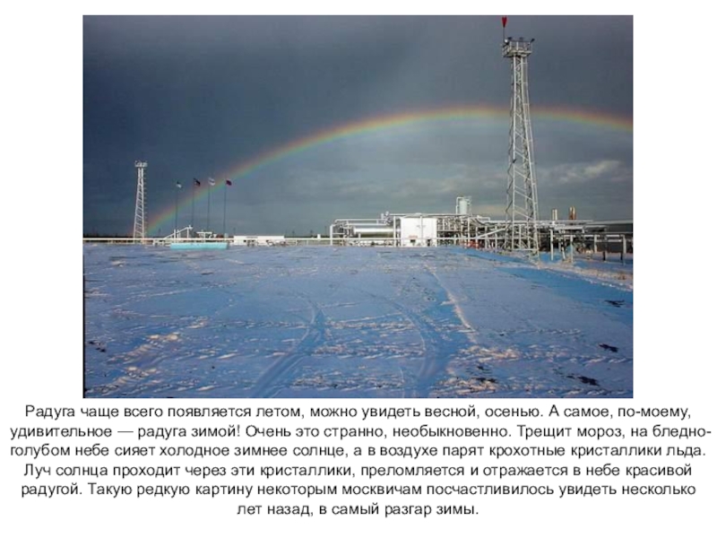 по-моему, удивительное — радуга зимой! Очень это странно, необыкновенно. Трещит мороз, на бледно-голубом небе сияет холодное зимнее солнце, а в воздухе парят крохотные кристаллики льда. Луч солнца проходит через эти кристаллики, преломляется и отражается в небе красивой радугой. Такую редкую картину некоторым москвичам посчастливилось увидеть несколько лет назад, в самый разгар зимы.
