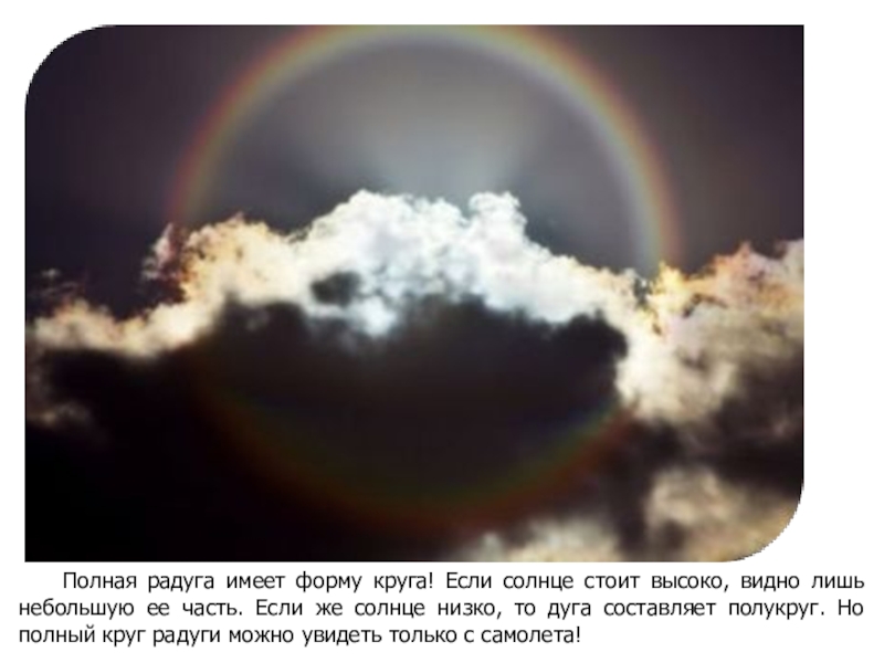 Слайд 15Полная радуга имеет форму круга! Если солнце стоит высоко, видно лишь