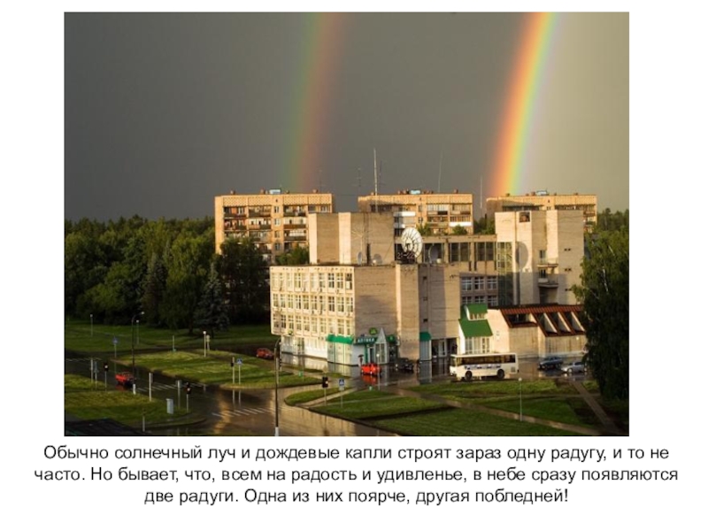 то не часто. Но бывает, что, всем на радость и удивленье, в небе сразу появляются две радуги. Одна из них поярче, другая побледней!