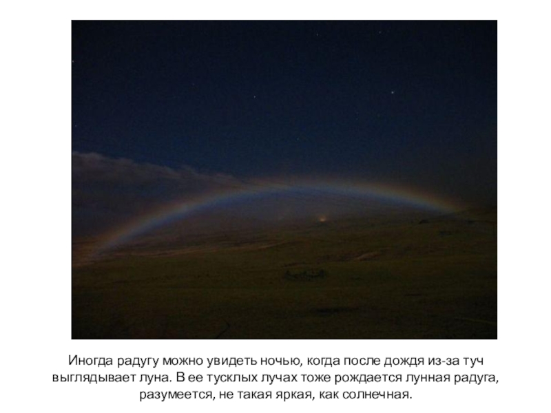 Слайд 14Иногда радугу можно увидеть ночью, когда после дождя из-за туч выглядывает