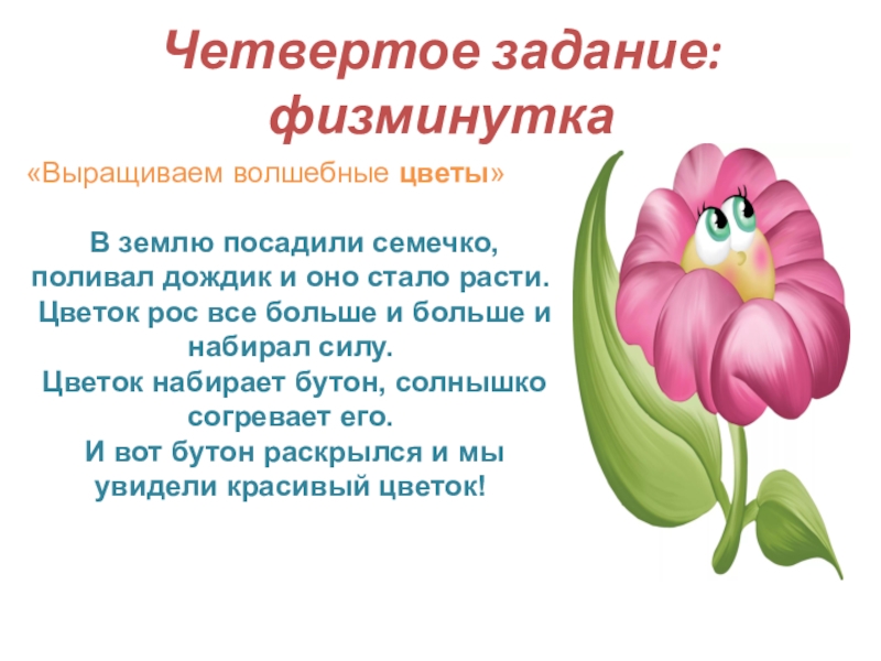 Четвертое задание:  физминутка«Выращиваем волшебные цветы» В землю посадили семечко, поливал дождик и оно стало расти. Цветок рос все больше