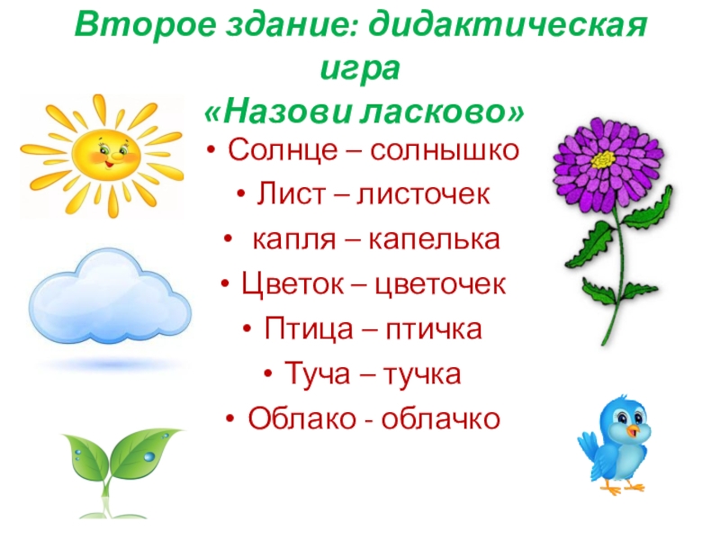 Второе здание: дидактическая игра  «Назови ласково»Солнце – солнышкоЛист – листочек капля – капелькаЦветок – цветочекПтица –