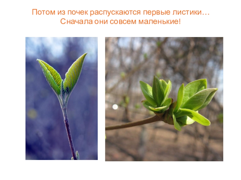 Слайд 9Потом из почек распускаются первые листики… Сначала они совсем маленькие!