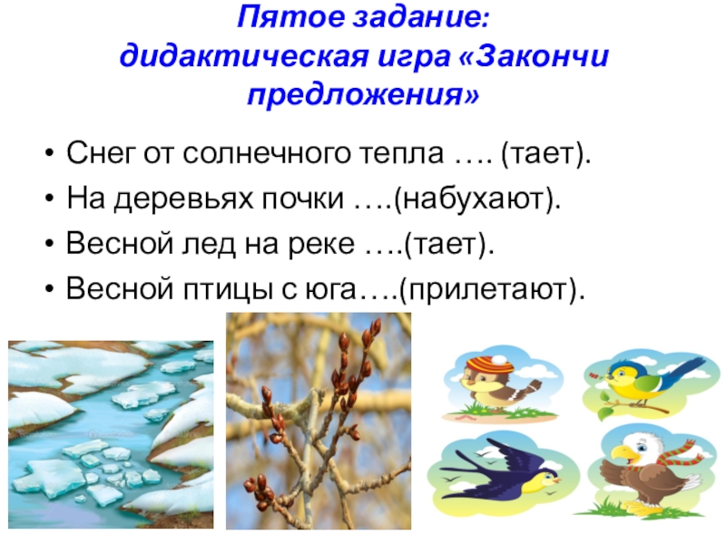 Пятое задание: дидактическая игра «Закончи предложения»  Снег от солнечного тепла …. (тает).На деревьях почки ….(набухают).Весной лед
