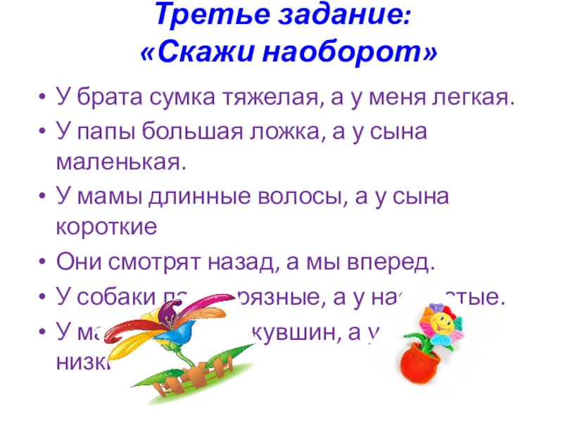 Третье задание:  «Скажи наоборот» У брата сумка тяжелая, а у меня легкая.У папы большая ложка, а