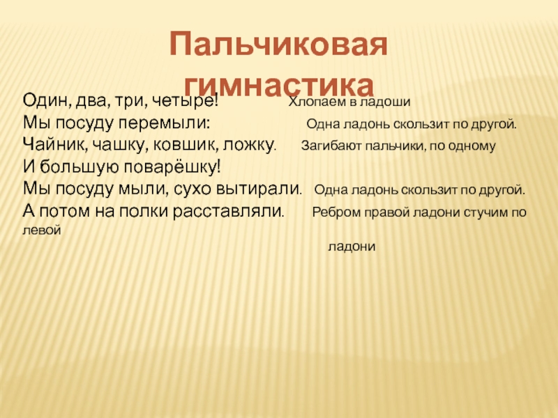 Мы посуду перемыли: Одна ладонь скользит по другой.