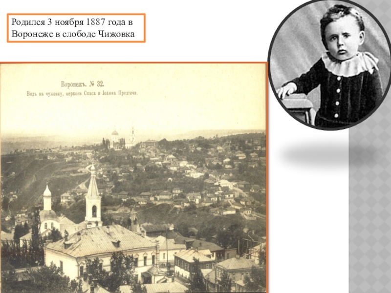 Слайд 6Родился 3 ноября 1887 года в Воронеже в слободе Чижовка
