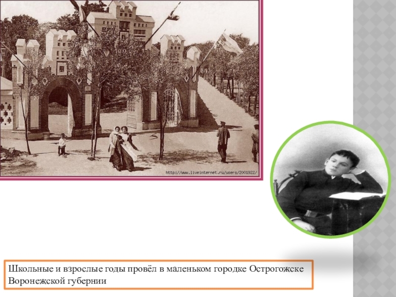 Слайд 9Школьные и взрослые годы провёл в маленьком городке Острогожске Воронежской губернии