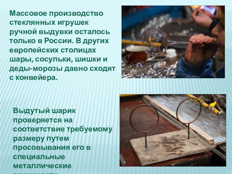 Выдутый шарик проверяется на соответствие требуемому размеру путем просовывания его в специальные металлические окружности.