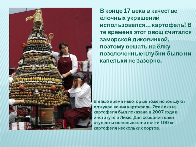 В наше время некоторые тоже используют для украшения картофель. Эта ёлка из картофеля был показана в 2007 году в институте в Лиме. Для создания елки студенты использовали почти 100 кг картофеля нескольких сортов.