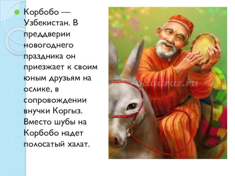 Слайд 20Корбобо — Узбекистан. В преддверии новогоднего праздника он приезжает к своим