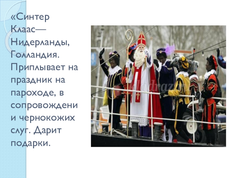 Слайд 15«Синтер Клаас—Нидерланды, Голландия. Приплывает на праздник на пароходе, в сопровождении чернокожих