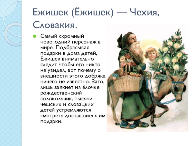 подарки в дома детей, Ежишек внимательно следит чтобы его никто не увидел, вот почему о внешности этого добряка ничего не известно. Зато, лишь звякнет на ёлочке рождественский колокольчик, тысячи чешских и словацких детей устремляются смотреть доставшиеся им подарки.