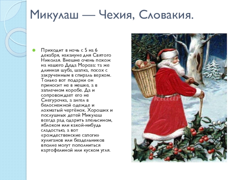 накануне дня Святого Николая. Внешне очень похож на нашего Деда Мороза: та же длинная шуба, шапка, посох с закрученным в спираль верхом. Только вот подарки он приносит не в мешке, а в заплечном коробе. Да и сопровождает его не Снегурочка, а ангел в белоснежной одежде и лохматый чертёнок. Хороших и послушных детей Микулаш всегда рад одарить апельсином, яблоком или какой-нибудь сладостью, а вот «рождественские сапоги» хулиганов или бездельников вполне могут пополниться картофелиной или куском угля.