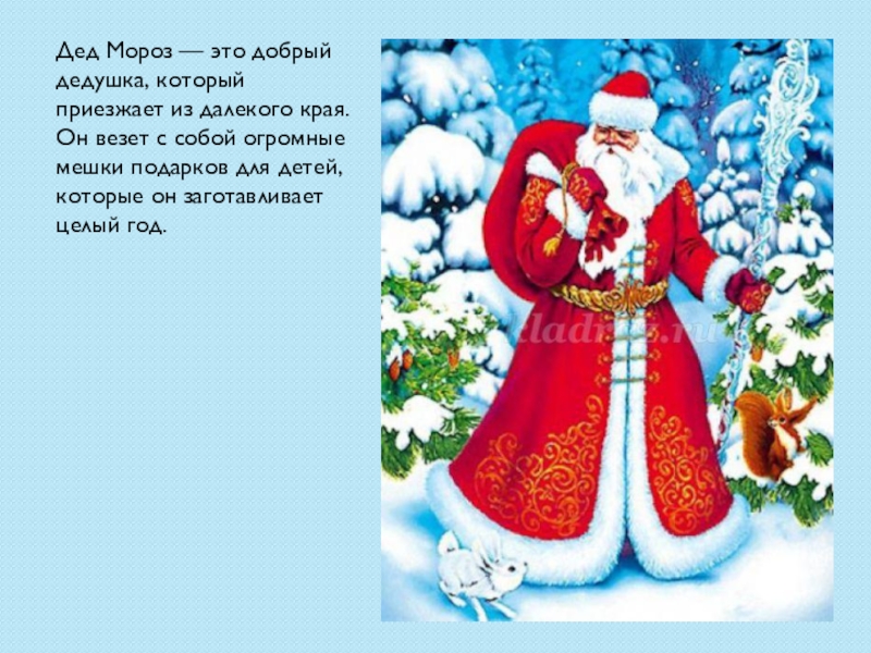Слайд 2Дед Мороз — это добрый дедушка, который приезжает из далекого края.
