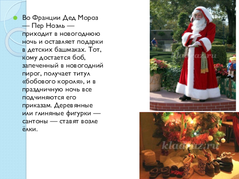 ночь и оставляет подарки в детских башмаках. Тот, кому достается боб, запеченный в новогодний пирог, получает титул «бобового короля», и в праздничную ночь все подчиняются его приказам. Деревянные или глиняные фигурки — сантоны — ставят возле ёлки.