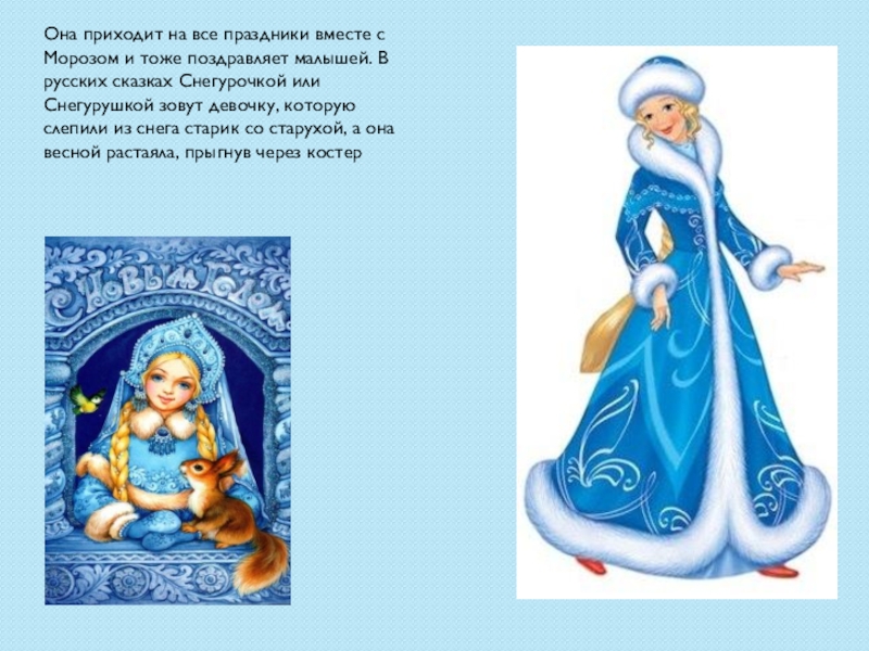 Слайд 6Она приходит на все праздники вместе с Морозом и тоже поздравляет