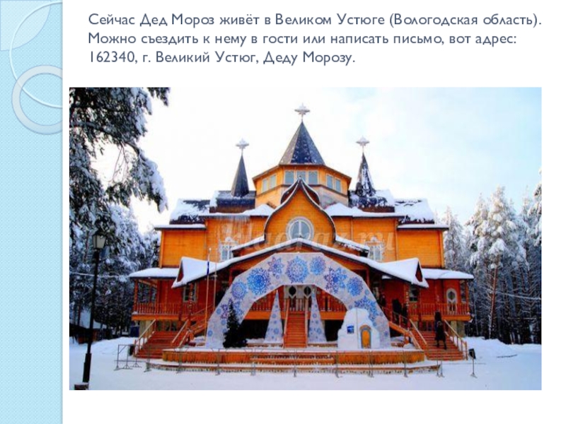 Слайд 4Сейчас Дед Мороз живёт в Великом Устюге (Вологодская область). Можно съездить