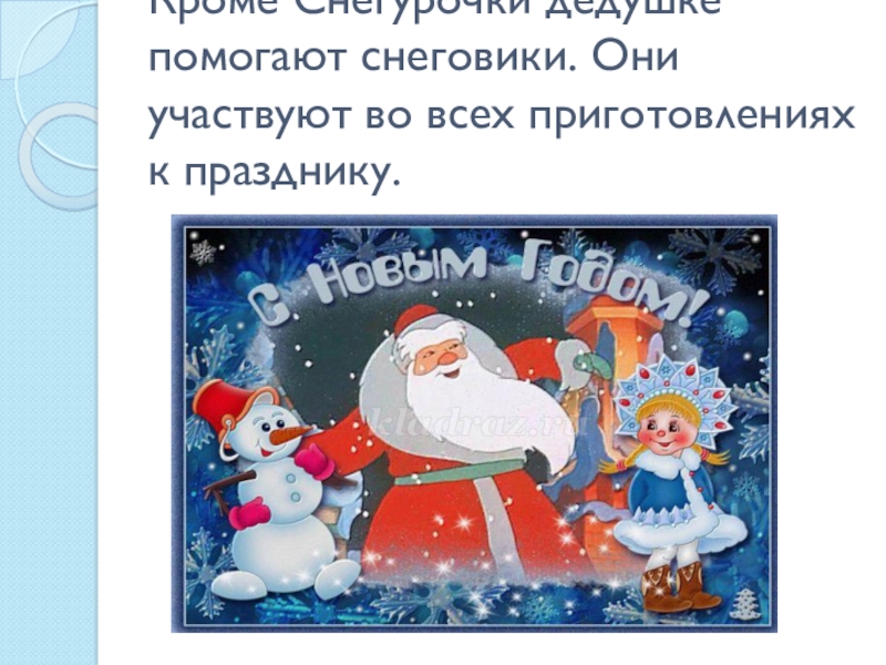 Слайд 8Кроме Снегурочки дедушке помогают снеговики. Они участвуют во всех приготовлениях к