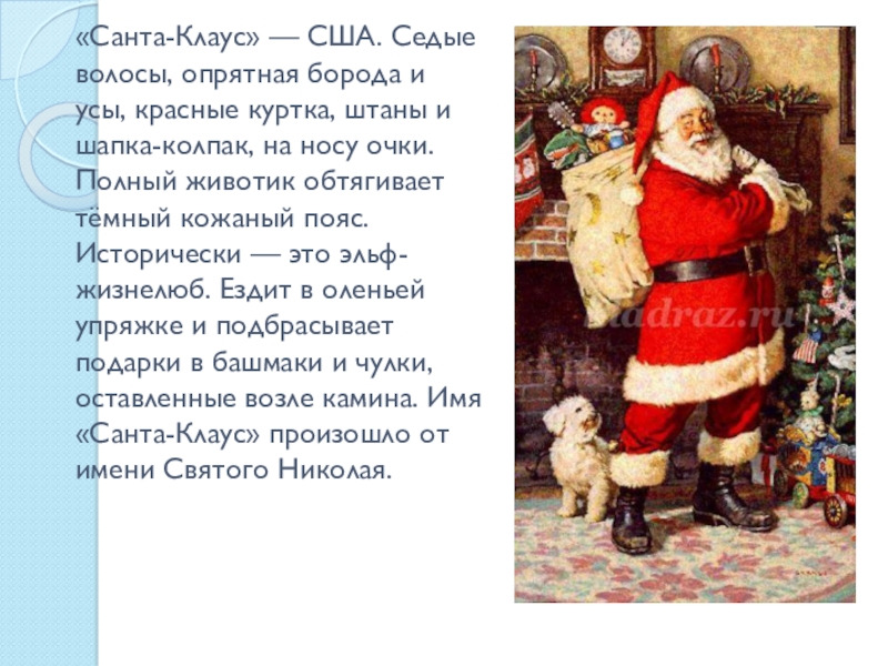 штаны и шапка-колпак, на носу очки. Полный животик обтягивает тёмный кожаный пояс. Исторически — это эльф-жизнелюб. Ездит в оленьей упряжке и подбрасывает подарки в башмаки и чулки, оставленные возле камина. Имя «Санта-Клаус» произошло от имени Святого Николая.