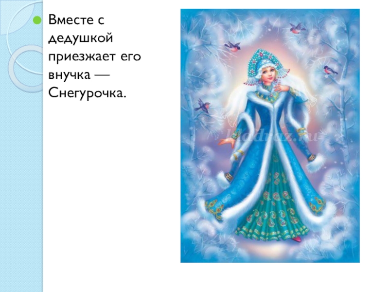Слайд 5Вместе с дедушкой приезжает его внучка — Снегурочка.
