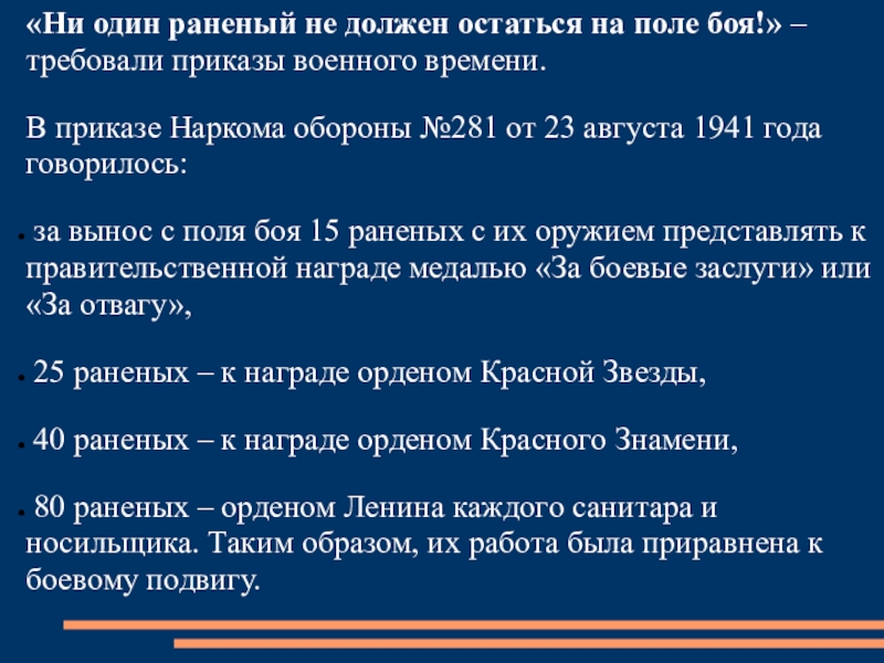 80 раненых – орденом Ленина каждого санитара и носильщика. Таким образом, их работа была приравнена к боевому подвигу.