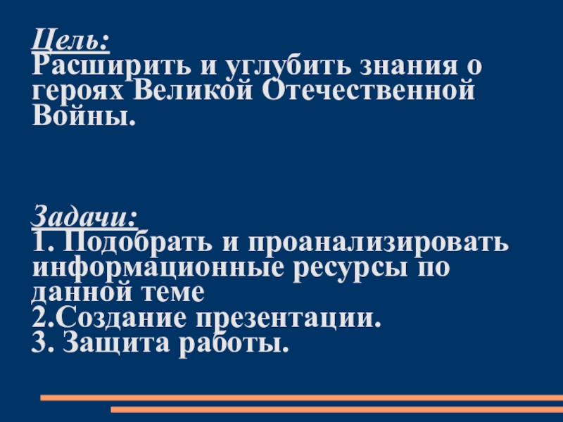 Расширить и углубить знания о героях Великой Отечественной Войны.
