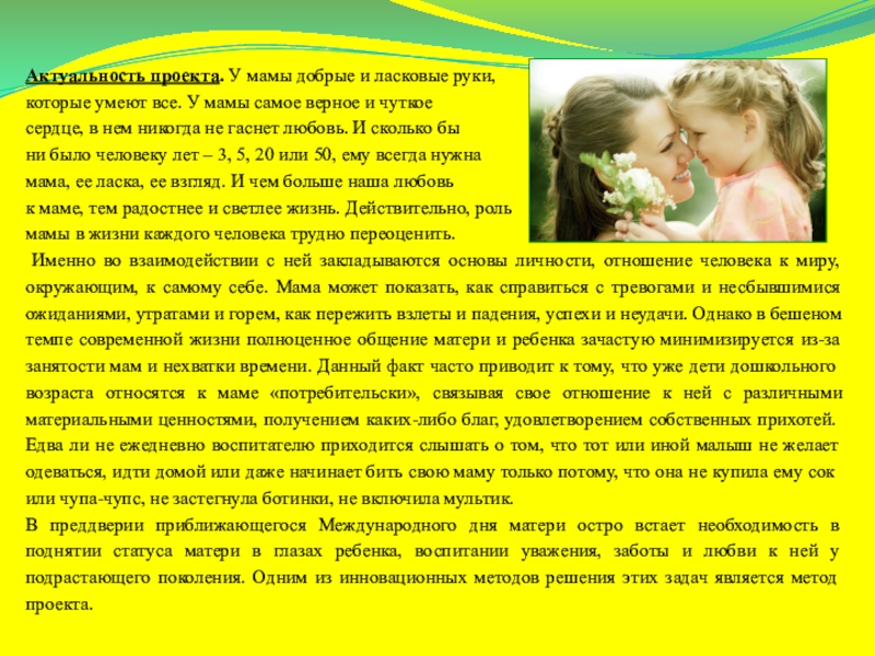 В преддверии приближающегося Международного дня матери остро встает необходимость в поднятии статуса матери в глазах ребенка, воспитании уважения, заботы и любви к ней у подрастающего поколения. Одним из инновационных методов решения этих задач является метод проекта.