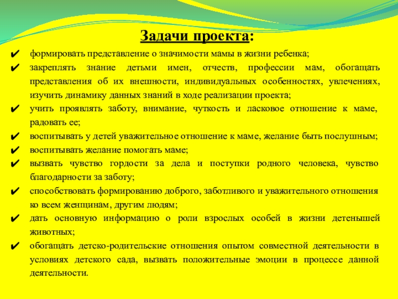 знание детьми имен, отчеств, профессии мам, обогащать представления об их внешности, индивидуальных особенностях, увлечениях, изучить динамику данных знаний в ходе реализации проекта;
