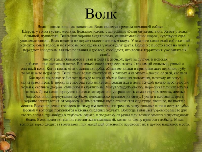 добычи – так охотиться легче. В волчьей стае всегда есть вожак. Это самый сильный, умный и опытный волк. Когда вожак стаи оскаливает зубы, обнажает клыки и приподнимает верхнюю губу – то он чем-то недоволен. Всей стаей волки охотятся на крупных животных – лосей, оленей, кабанов. Как правило, волки забивают прежде всего слабых и больных животных, поэтому их зовут санитарами леса. В трескучие морозы волкам нечем поживиться в лесу. Глухой ночью пробираются волки к скотным дворам, овчарням и курятникам. Могут утащить овечку, поросенка или напасть на теленка. Днем волки прячутся в логове, которое они устраивают в самых глухих местах, лесных чащобах, или, свернувшись клубком, неподвижно дремлют на снегу. Густая и плотная шерсть хорошо защищает их от морозов. К зиме волчья шуба становится еще гуще, пышнее, но цвет не меняет. Волки не делают запасов на зиму, им помогают пережить зиму сильные ноги и острые зубы. Весной у волчицы появляются маленькие слепые волчата. Волчица выбирает укромное место для своего логова, где-нибудь в глубоком овраге, неподалеку от ручья или возле больших непроходимых болот. Волк помогает волчице воспитывать малышей, ходит на охоту, приносит добычу. Мама волчица зорко следит за волчатами, при малейшей опасности переносит их в другое надежное место.