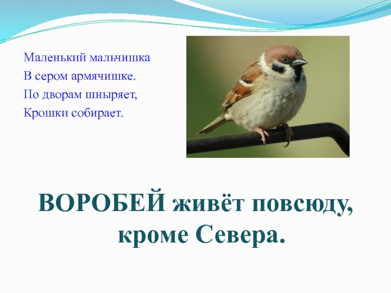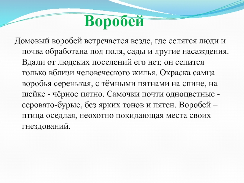 поля, сады и другие насаждения. Вдали от людских поселений его нет, он селится только вблизи человеческого жилья. Окраска самца воробья серенькая, с тёмными пятнами на спине, на шейке - чёрное пятно. Самочки почти одноцветные - серовато-бурые, без ярких тонов и пятен. Воробей – птица оседлая, неохотно покидающая места своих гнездований.