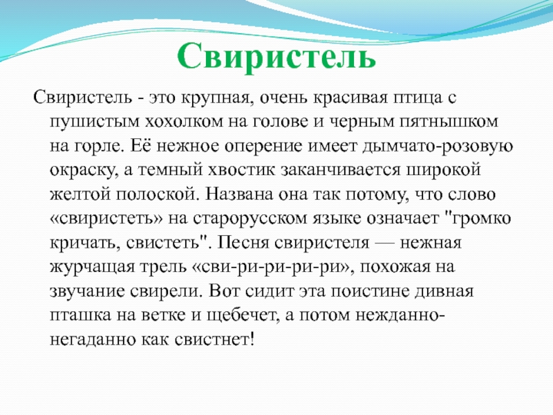 голове и черным пятнышком на горле. Её нежное оперение имеет дымчато-розовую окраску, а темный хвостик заканчивается широкой желтой полоской. Названа она так потому, что слово «свиристеть» на старорусском языке означает "громко кричать, свистеть". Песня свиристеля — нежная журчащая трель «сви-ри-ри-ри-ри», похожая на звучание свирели. Вот сидит эта поистине дивная пташка на ветке и щебечет, а потом нежданно-негаданно как свистнет!