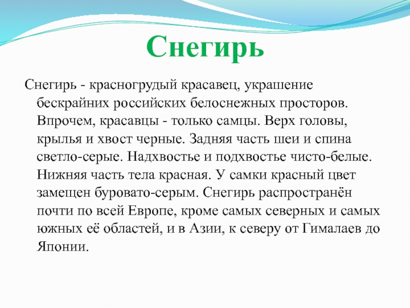 - только самцы. Верх головы, крылья и хвост черные. Задняя часть шеи и спина светло-серые. Надхвостье и подхвостье чисто-белые. Нижняя часть тела красная. У самки красный цвет замещен буровато-серым. Снегирь распространён почти по всей Европе, кроме самых северных и самых южных её областей, и в Азии, к северу от Гималаев до Японии.