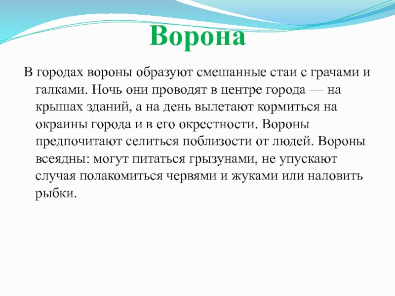они проводят в центре города — на крышах зданий, а на день вылетают кормиться на окраины города и в его окрестности. Вороны предпочитают селиться поблизости от людей. Вороны всеядны: могут питаться грызунами, не упускают случая полакомиться червями и жуками или наловить рыбки.