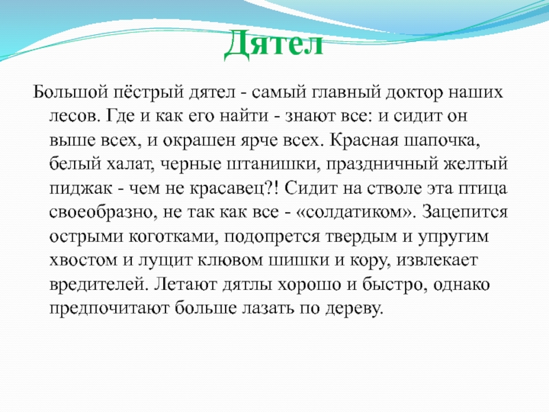 как его найти - знают все: и сидит он выше всех, и окрашен ярче всех. Красная шапочка, белый халат, черные штанишки, праздничный желтый пиджак - чем не красавец?! Сидит на стволе эта птица своеобразно, не так как все - «солдатиком». Зацепится острыми коготками, подопрется твердым и упругим хвостом и лущит клювом шишки и кору, извлекает вредителей. Летают дятлы хорошо и быстро, однако предпочитают больше лазать по дереву.