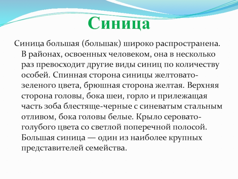 несколько раз превосходит другие виды синиц по количеству особей. Спинная сторона синицы желтовато-зеленого цвета, брюшная сторона желтая. Верхняя сторона головы, бока шеи, горло и прилежащая часть зоба блестяще-черные с синеватым стальным отливом, бока головы белые. Крыло серовато-голубого цвета со светлой поперечной полосой. Большая синица — один из наиболее крупных представителей семейства.